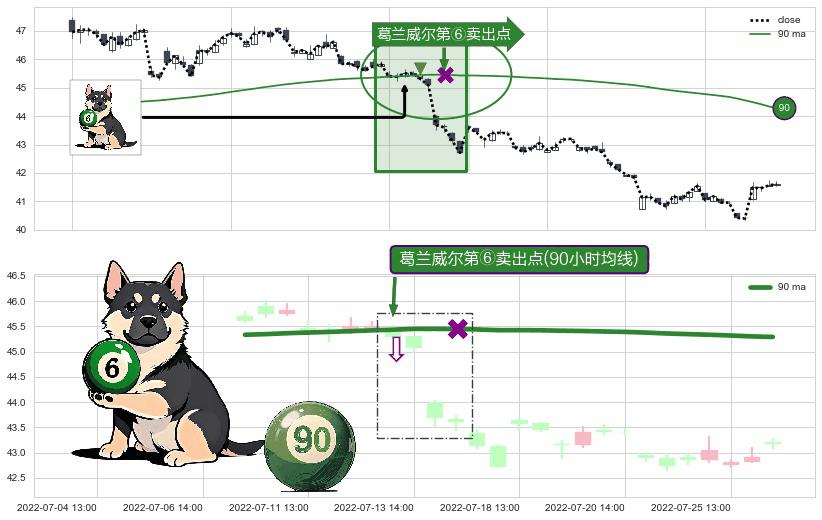 ⚀ 2022-07-13 13:00:00-小时显现 葛兰威尔均线 90小时均线 第⑥卖出点 走势反转见顶信号,后市看跌,卖出信号