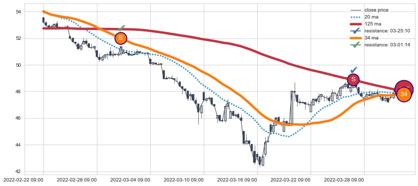 ⚂ 2022-06-15 09:00:00-小时均线向上突破,2022-07-14 13:00:00-小时重新下穿均线破位,均线阻力再次生效