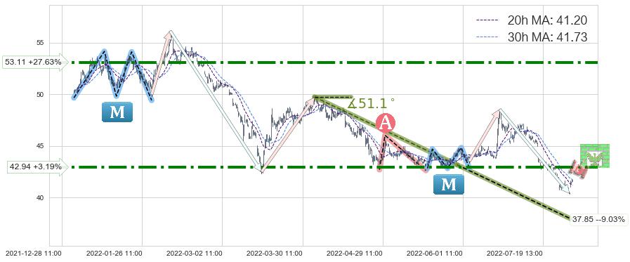 ♘ 阻力价格位42.94,可信任强度77.49%,距离最后交易2022-08-12 14:00形成的收盘价格41.61相差 +3.19%