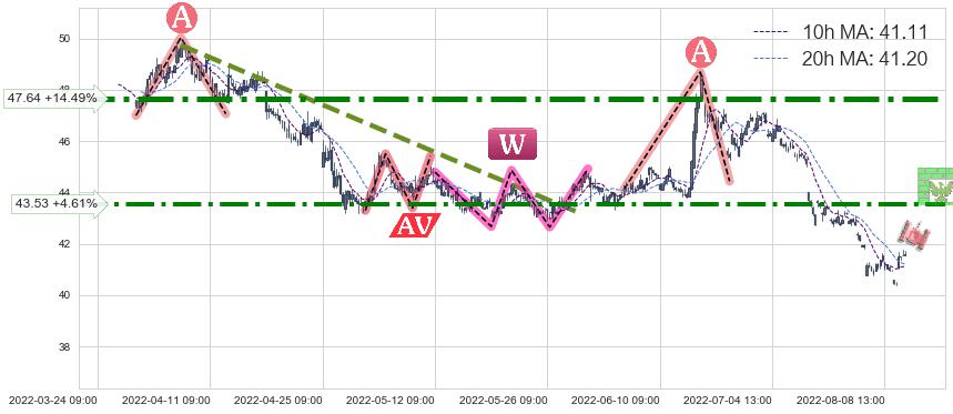 ♘ 阻力价格位43.53,可信任强度83.49%,距离最后交易2022-08-12 14:00形成的收盘价格41.61相差 +4.61%