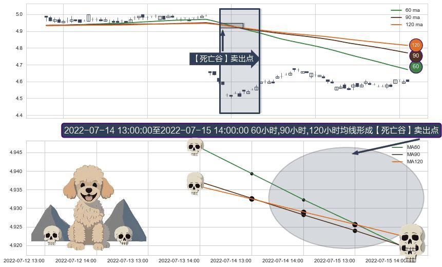 ⚀ 2022-07-14 14:00:00-小时至2022-07-15 14:00:00-小时显现 60小时-90小时-120小时均线 【死亡谷】卖出点 看空信号,后市看跌,卖出
