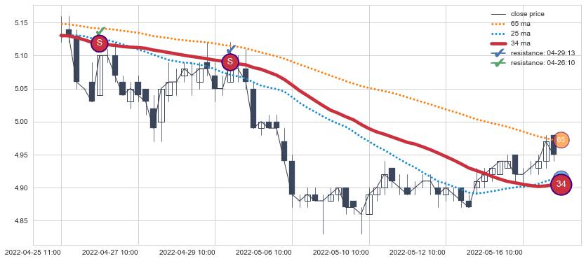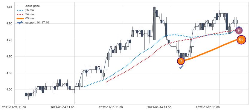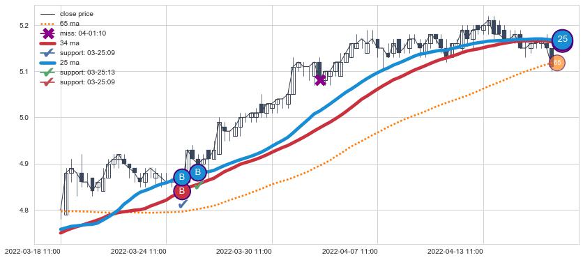 ⚀ 2022-07-01 14:00:00小时-2022-07-18 13:00:00小时显现 5小时-10小时-20小时均线 【高山滑雪】买入点 看多信号,后市看涨,买入