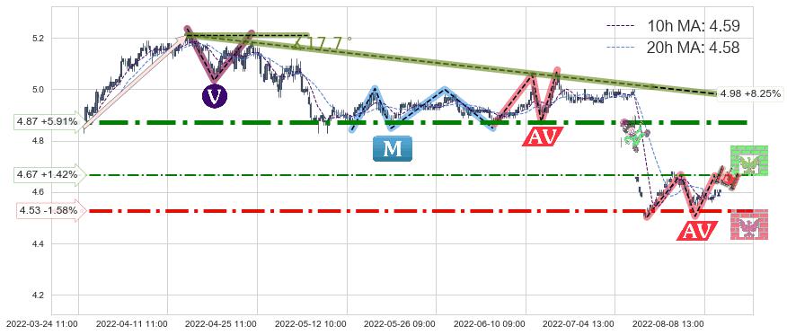 ♘ 阻力价格位4.67,可信任强度39.85%,距离最后交易2022-08-12 14:00形成的收盘价格4.60相差 +1.42%