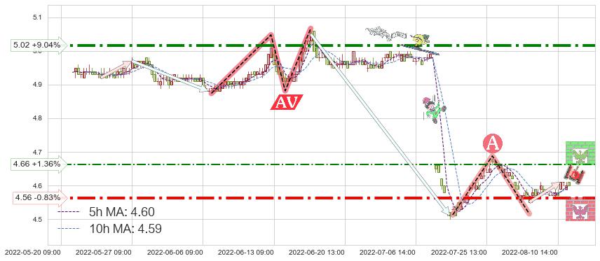 ♘ 阻力价格位4.66,可信任强度45.87%,距离最后交易2022-08-12 14:00形成的收盘价格4.60相差 +1.36%