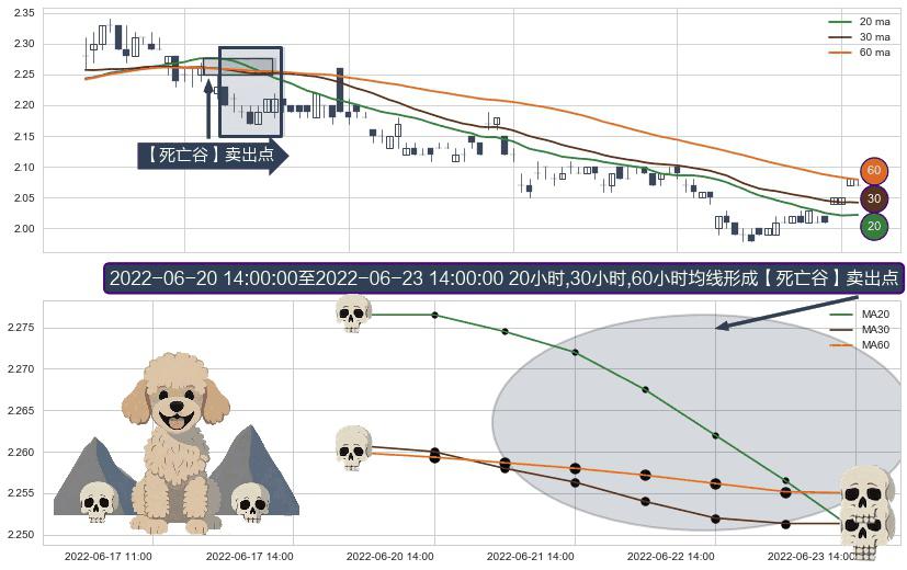 形态多维评估: ⚀ 2022-06-21 13:00:00-小时至2022-06-23 14:00:00-小时显现 20小时-30小时-60小时均线 【死亡谷】卖出点 看空信号,后市看跌,卖出