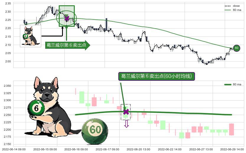 形态多维评估: ⚀ 2022-06-17 10:00:00-小时显现 葛兰威尔均线 60小时均线 第⑥卖出点 走势反转见顶信号,后市看跌,卖出信号
