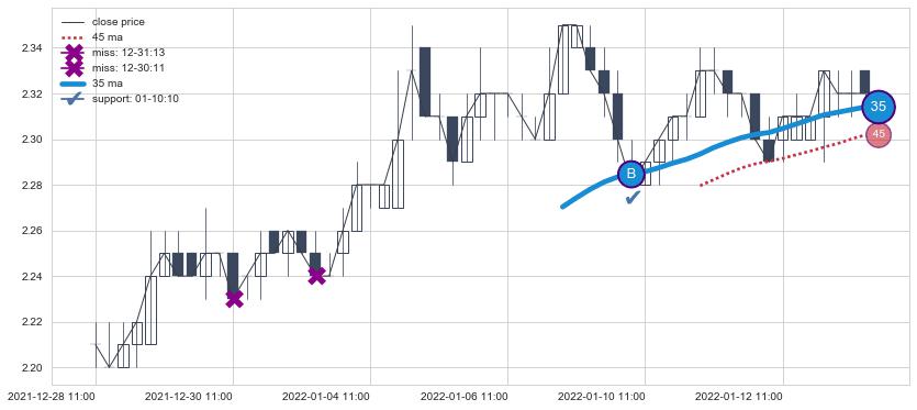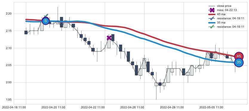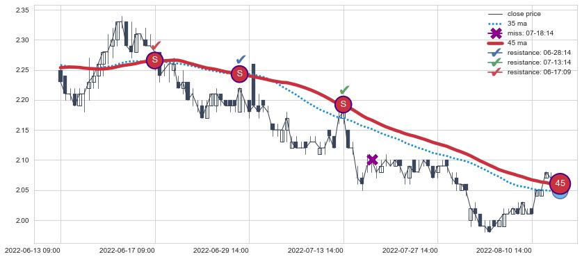 下跌趋势02-23 11:00-03-22 14:00,均线35, 45确认关键阻力3处