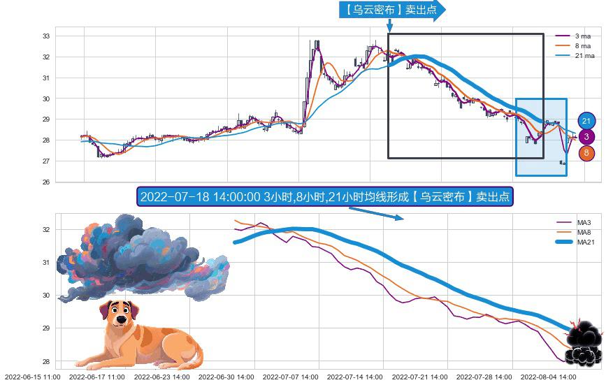 形态多维评估: ⚀ 2022-06-29 13:00:00小时-2022-08-04 14:00:00小时显现 3小时-8小时-21小时均线 【乌云密布】卖出点 看空信号,后市看跌,卖出