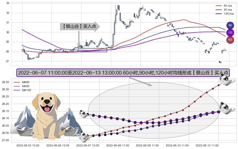 ⚂ 【银山谷】买入点 由MA60均线上穿MA90均线和MA120均线,MA90均线上穿MA120均线形成