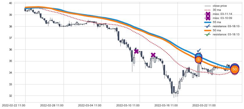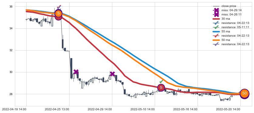 下跌趋势04-19 14:00-05-20 14:00,均线50, 30, 55确认关键阻力2处
