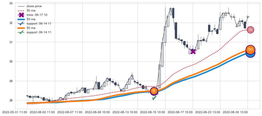 上涨趋势05-31 11:00-06-30 13:00,均线50, 55确认关键支撑1处