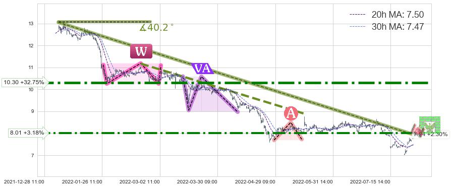 🦴 长线均值回复组合短线趋势跟踪[强阻力信号]2022-01-05 10:00-2022-08-12 14:00下跌趋势依然成立(下跌趋势跟踪依然存在),短线价格略微上行反弹(均值回复猜想),即将接近下跌趋势提供的未破位阻力价格:7.94。