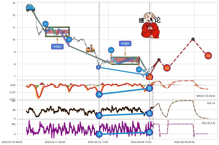 | 3 🅚:【高山滑雪】买入点 ➕ ☯️:缠论买卖点下降缠中枢AB形成后猜想拐点1买已到达,猜想后续持续拉升(均值回复) ☞ 看多信号 ⇥ 【均线】交织【图形】⇥ 综合量化分数: 53 | > |