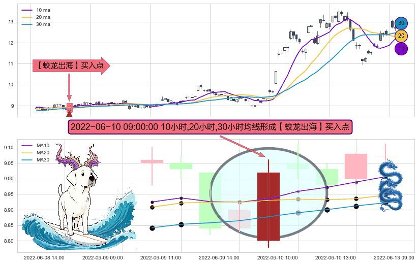 形态多维评估: ⚀ 2022-06-10 09:00:00小时显现 10小时-20小时-30小时均线 【蛟龙出海】买入点 看多信号,后市看涨,买入