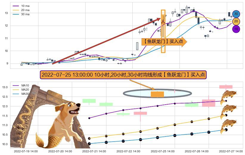 形态多维评估: ⚀ 2022-07-25 13:00:00小时显现 10小时-20小时-30小时均线 【鱼跃龙门】买入点 看多信号,后市看涨,买入