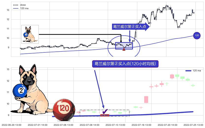 形态多维评估: ⚀ 2022-07-11 13:00:00-小时显现 葛兰威尔均线 120小时均线 第②买入点 上升趋势的中继信号,后市看涨,买进信号