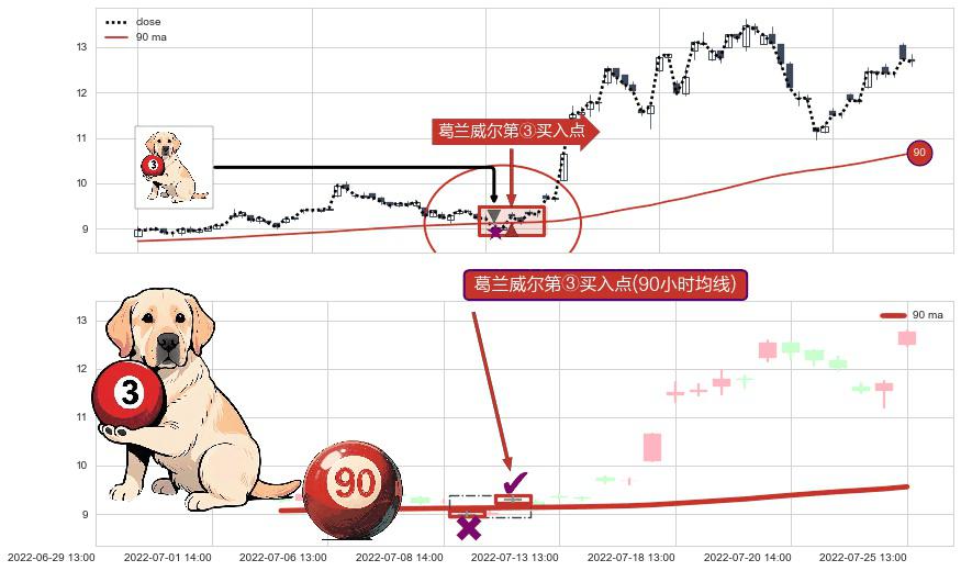 形态多维评估: ⚀ 2022-07-12 13:00:00-小时显现 葛兰威尔均线 90小时均线 第③买入点 上升趋势的中继信号,后市看涨,买进信号