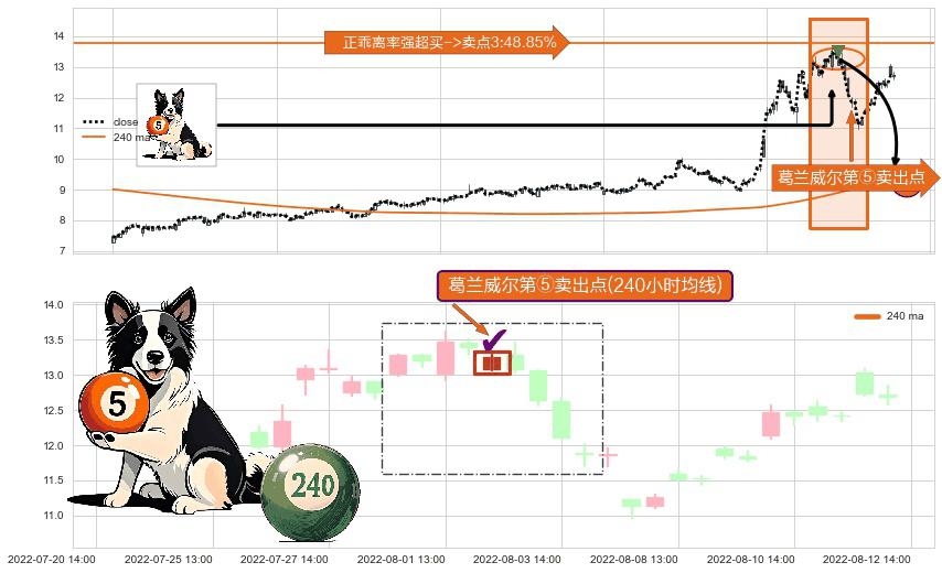 形态多维评估: ⚀ 2022-08-02 13:00:00-小时显现 葛兰威尔均线 240小时均线 第⑤卖出点 上升趋势均值回复的短线回落信号,后市看跌,卖出信号