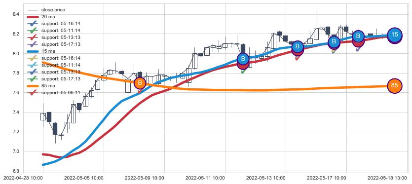 上涨趋势04-28 10:00-05-18 13:00,均线20, 85, 15确认关键支撑5处