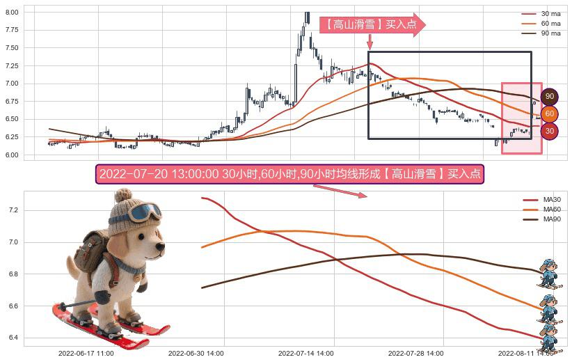 形态多维评估: ⚀ 2022-06-28 14:00:00小时-2022-08-10 14:00:00小时显现 30小时-60小时-90小时均线 【高山滑雪】买入点 看多信号,后市看涨,买入