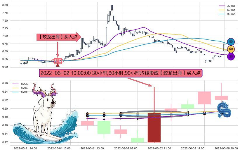 形态多维评估: ⚀ 2022-06-02 10:00:00小时显现 30小时-60小时-90小时均线 【蛟龙出海】买入点 看多信号,后市看涨,买入