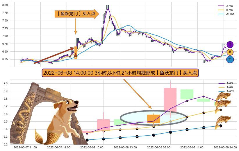 形态多维评估: ⚀ 2022-06-08 14:00:00小时显现 3小时-8小时-21小时均线 【鱼跃龙门】买入点 看多信号,后市看涨,买入