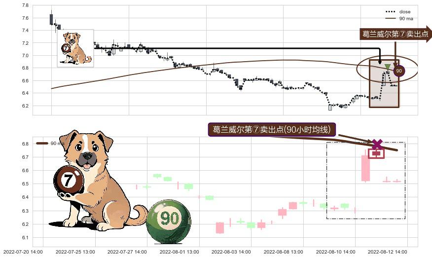 形态多维评估: ⚀ 2022-08-11 14:00:00-小时显现 葛兰威尔均线 90小时均线 第⑦卖出点 下降趋势的中继信号,后市看跌,卖出信号