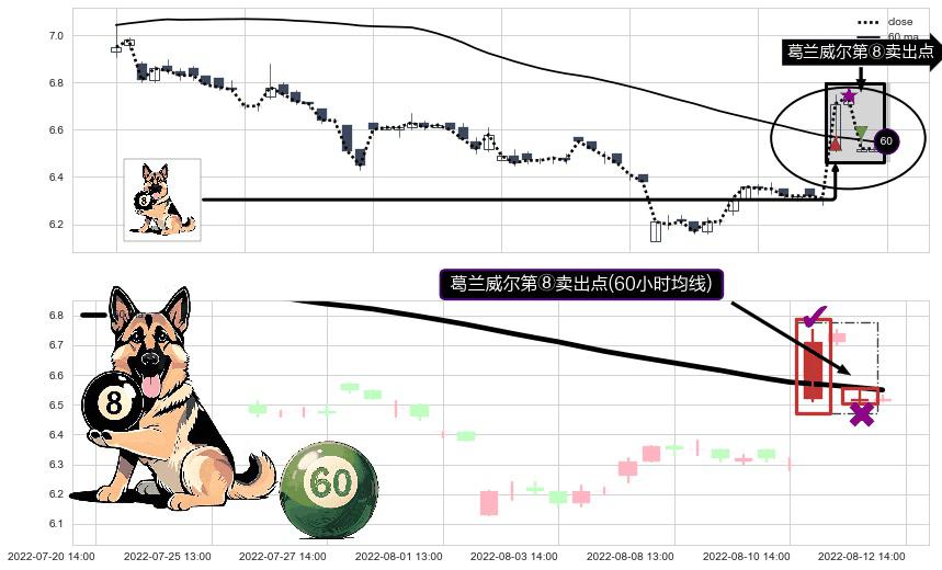 形态多维评估: ⚀ 2022-08-12 13:00:00-小时显现 葛兰威尔均线 60小时均线 第⑧卖出点 下降趋势的中继信号,后市看跌,卖出信号
