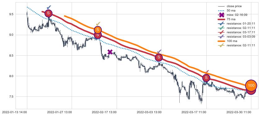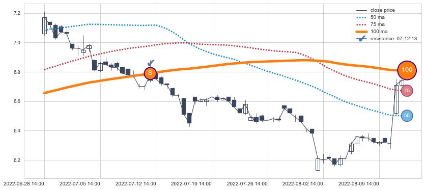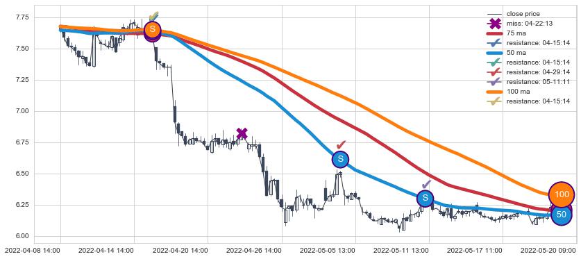 下跌趋势04-08 14:00-05-20 09:00,均线50, 75, 100确认关键阻力3处