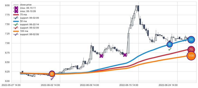 上涨趋势05-27 14:00-06-29 13:00,均线50, 75, 100确认关键支撑2处