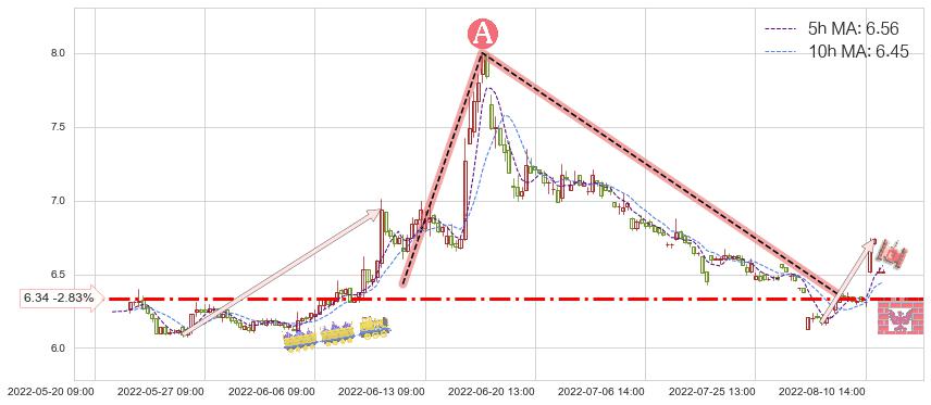 2022-05-24: 第一支撑位6.34强力阻拦了上升趋势,成功阻止了价格的继续上涨。