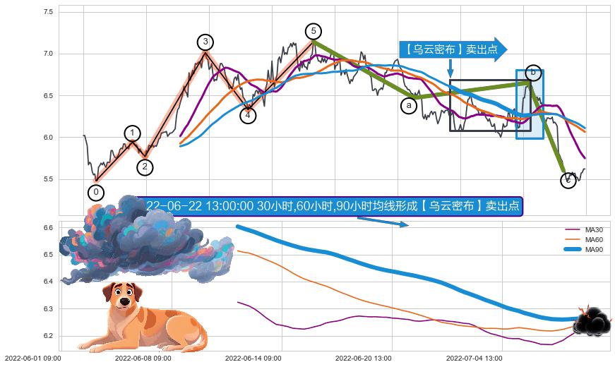➣ 🕰 价格走势在2022-07-06 14:00:00至2022-07-20 14:00:00期间形成【乌云密布】卖出点,残存影响值:-30.62