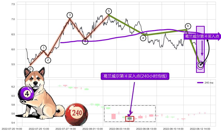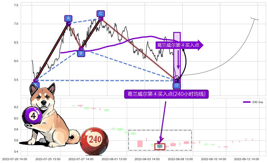 ➣ 🕰 价格走势在2022-07-28 14:00:00至2022-08-09 14:00:00期间形成葛兰威尔第④买入点,残存影响值:12.43