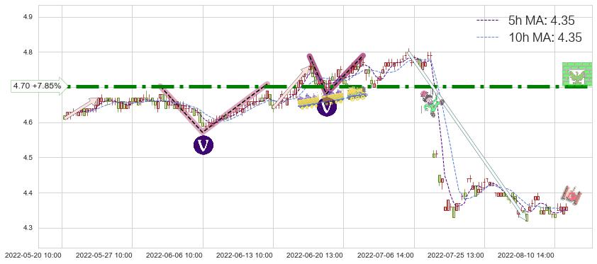 2022-06-10: 第一阻力位4.70强力阻拦了上升趋势,成功阻止了价格的继续上涨。