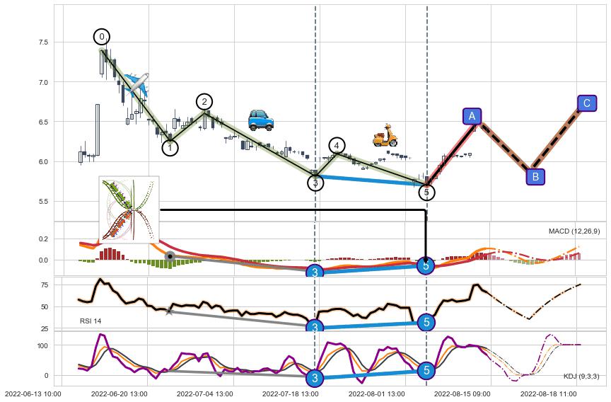 ➣ 1,3,5驱动浪MACD, RSI, KDJ走势都出现【常规背离】反转信号增强