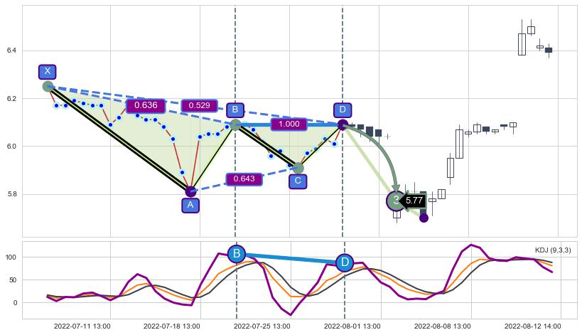 ➢ 谐波价格D点比B点高 ⤴,【KDJ】指标D点比B点低 ⤵️