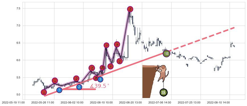 从2022-05-24 14:00至2022-07-04 14:00,共包含105个小时,阶段股价上涨23.04%,阶段股价变动位移路程比: 1 : 5,上涨趋势角度: 39.5