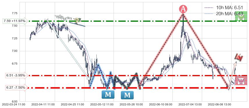 ♘ 阻力价格位7.59,可信任强度74.77%,距离最后交易2022-08-12 14:00形成的收盘价格6.78相差 +11.97%