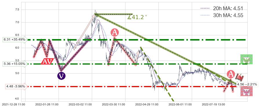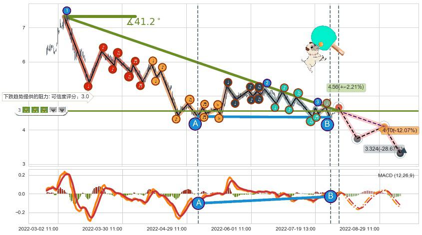 🦴 长线均值回复组合短线趋势跟踪[强阻力信号]2022-03-04 11:00-2022-08-12 14:00下跌趋势依然成立(下跌趋势跟踪依然存在),短线价格略微上行反弹(均值回复猜想),即将接近下跌趋势提供的未破位阻力价格:4.56。