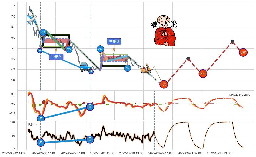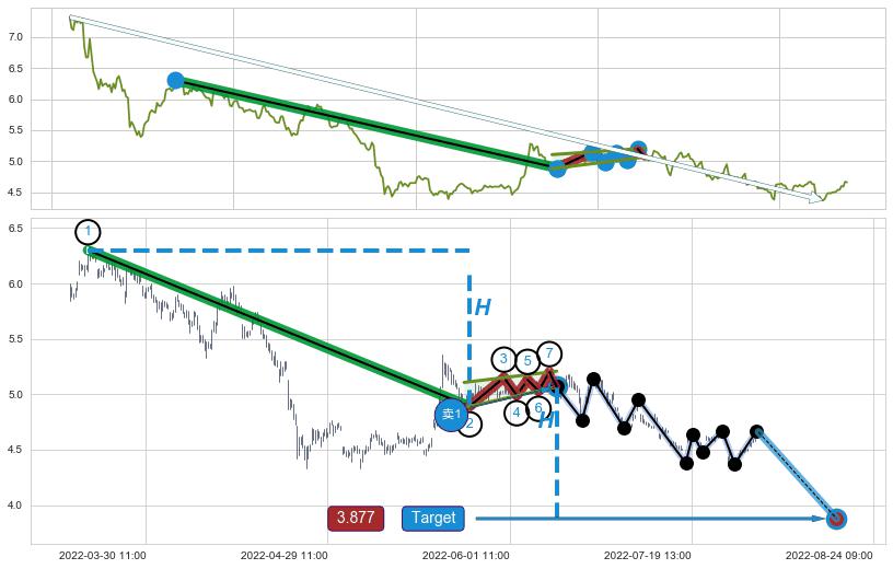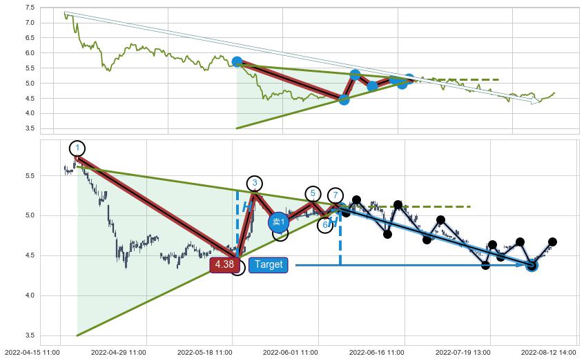 从2022-04-14 13:00至2022-05-20 14:00,共包含117个小时,阶段股价下跌-14.22%,阶段股价变动位移路程比: 1 : 7,下跌趋势角度: 75.1