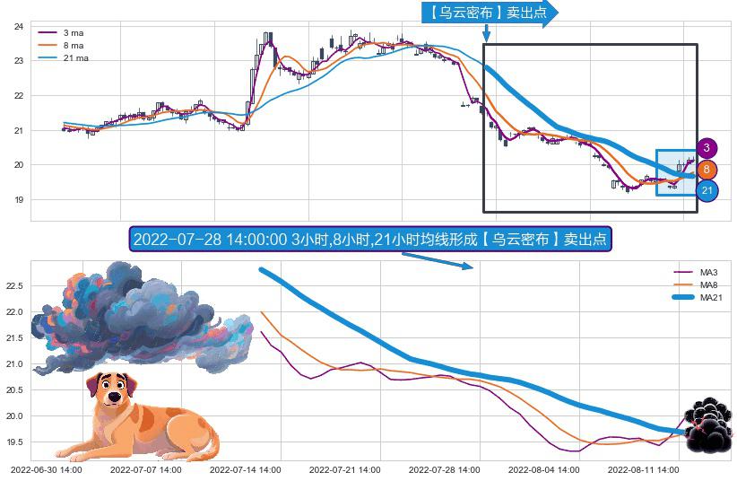 形态多维评估: ⚀ 2022-07-13 14:00:00小时-2022-08-12 14:00:00小时显现 3小时-8小时-21小时均线 【乌云密布】卖出点 看空信号,后市看跌,卖出