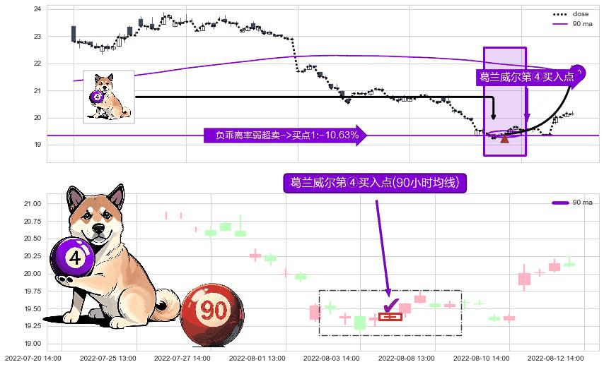 形态多维评估: ⚀ 2022-08-04 14:00:00-小时显现 葛兰威尔均线 90小时均线 第④买入点 下降趋势均值回复的短线反弹信号,后市看涨,买进信号