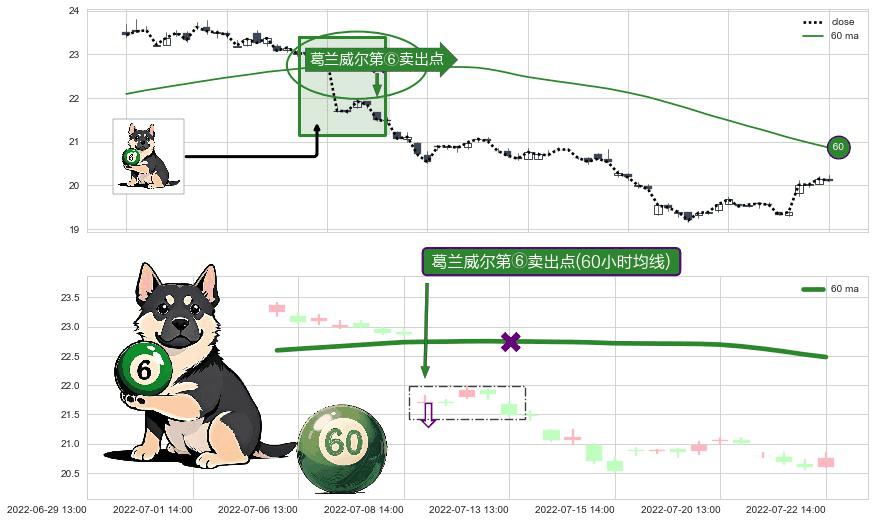 形态多维评估: ⚀ 2022-07-11 13:00:00-小时显现 葛兰威尔均线 60小时均线 第⑥卖出点 走势反转见顶信号,后市看跌,卖出信号