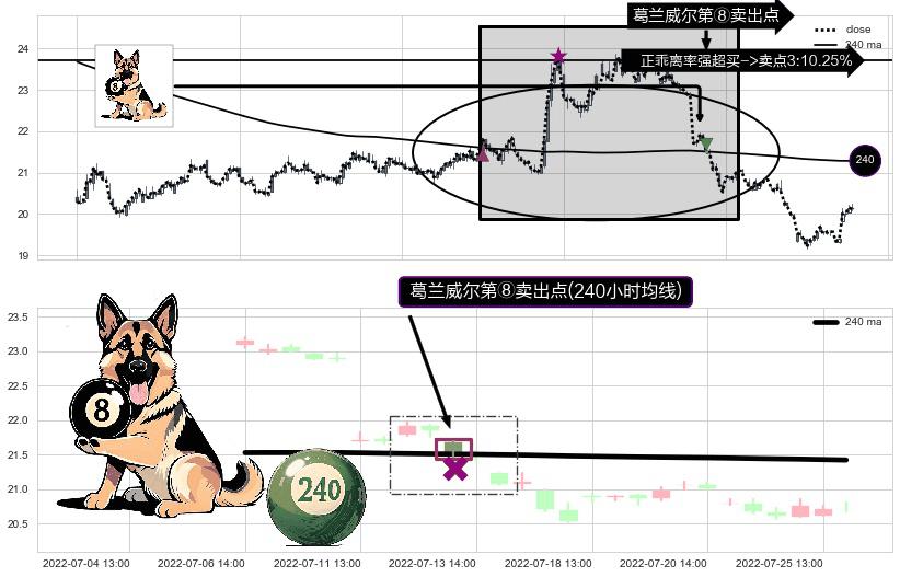 形态多维评估: ⚀ 2022-07-13 13:00:00-小时显现 葛兰威尔均线 240小时均线 第⑧卖出点 下降趋势的中继信号,后市看跌,卖出信号