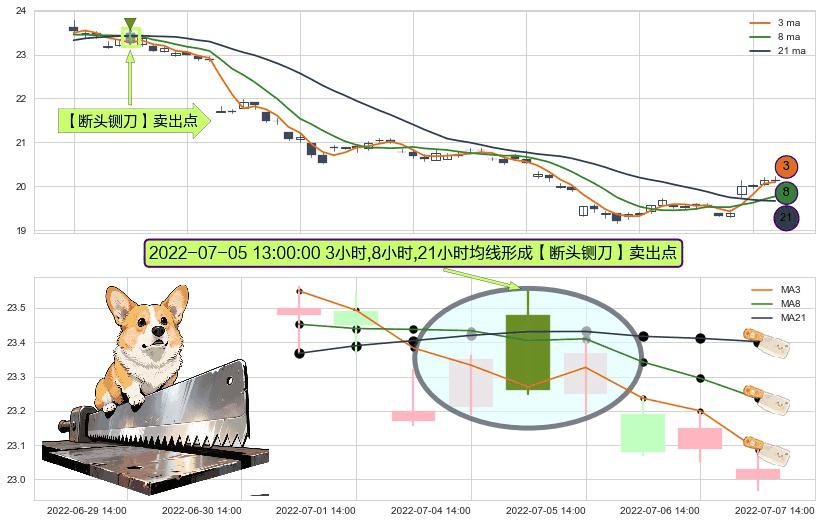 形态多维评估: ⚀ 2022-07-05 13:00:00小时显现 3小时-8小时-21小时均线 【断头铡刀】卖出点 看空信号,后市看跌,卖出
