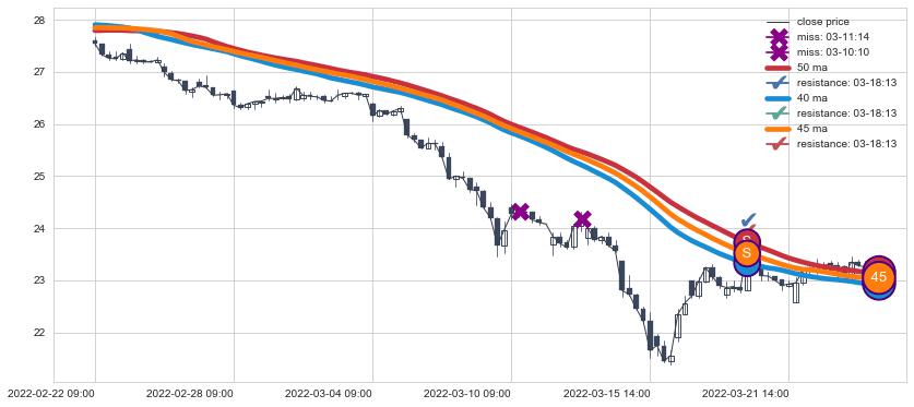 下跌趋势02-22 09:00-03-24 09:00,均线40, 50, 45确认关键阻力1处