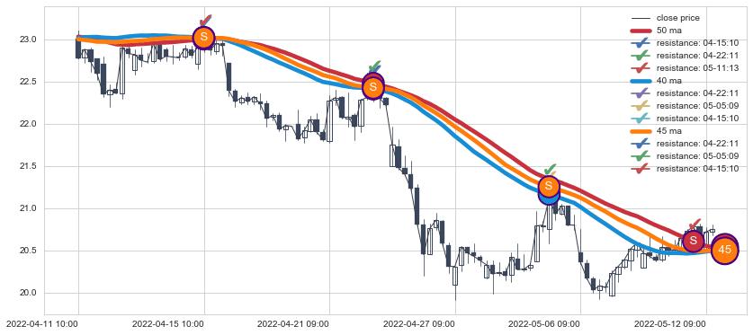 下跌趋势04-11 10:00-05-12 10:00,均线40, 50, 45确认关键阻力4处