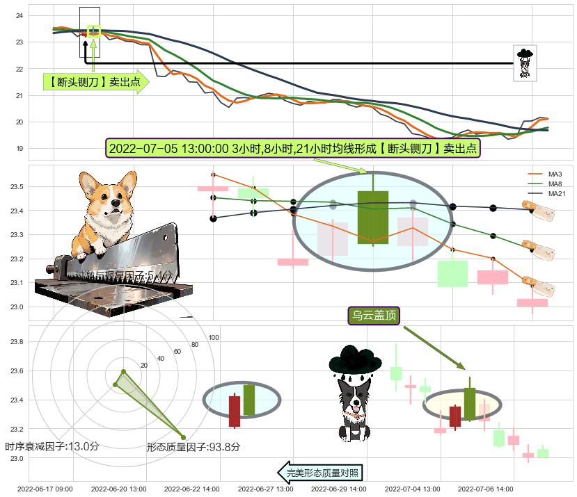 从2022-06-23 14:00至2022-08-12 14:00,共包含73个小时,阶段股价下跌-16.28%,阶段股价变动位移路程比: 1 : 3,2022-07-11 13:00向↘︎形成缺口,跳空下跌-5.11%˚