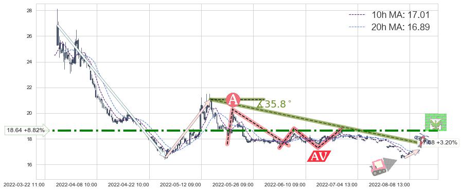 2022-06-22: 第一阻力位18.64强力阻拦了上升趋势,成功阻止了价格的继续上涨。