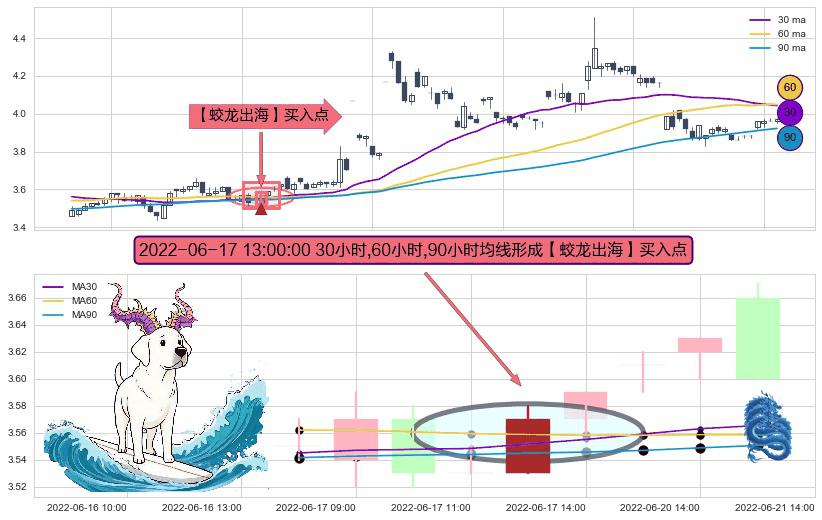 形态多维评估: ⚀ 2022-06-17 13:00:00小时显现 30小时-60小时-90小时均线 【蛟龙出海】买入点 看多信号,后市看涨,买入